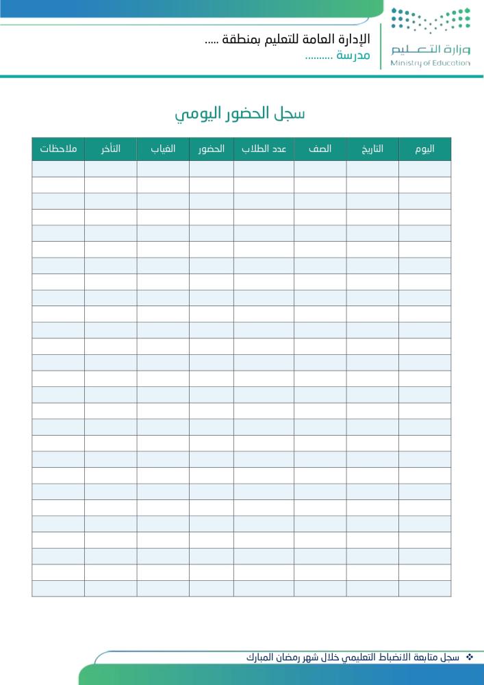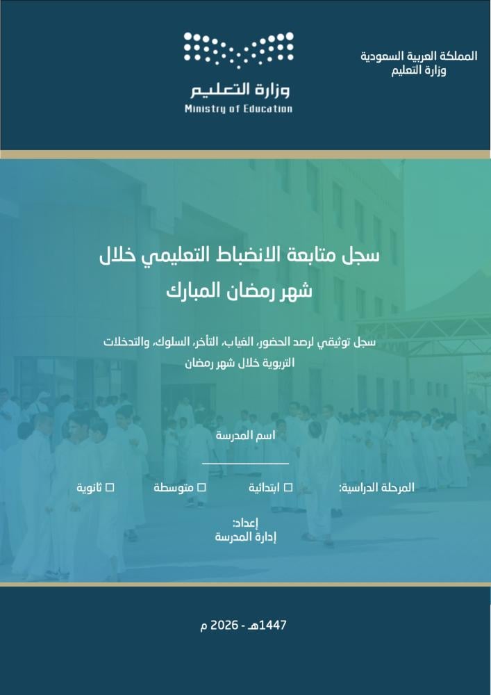 أُعد هذا السجل ليكون عمليًا، واضحًا، وسهل الاستخدام، وقابلًا للطباعة والتعبئة المباشرة، بما يدعم اتخاذ القرار التربوي ويعزز استقرار البيئة المدرسية خلال الشهر الفضيل.