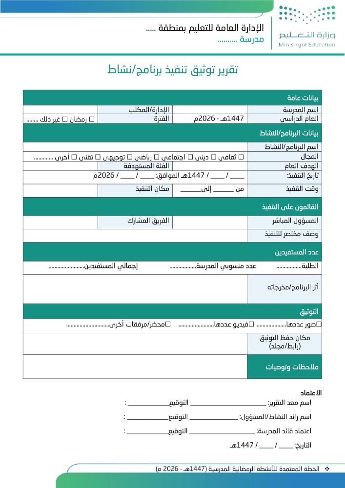 ملف رسمي متكامل يضم الخطة المعتمدة للأنشطة الرمضانية المدرسية، أُعد بصيغة نماذج مفرغة قابلة للتعبئة، لمساعدة المدارس على تخطيط وتنفيذ وتوثيق الأنشطة الطلابية خلال شهر رمضان المبارك وفق التقويم الدراسي المعتمد.