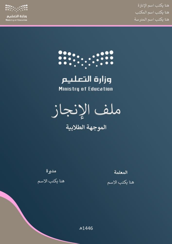 غلاف الملف ويُكتب فيه: اسم الإدارة، المكتب، المدرسة، واسم المعلمة والمديرة .
