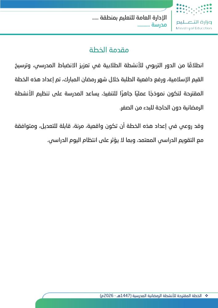 خطة تنفيذية متكاملة معبّأة بالكامل للأنشطة الرمضانية المدرسية، أُعدت لتكون نموذجًا عمليًا جاهزًا للتطبيق أو التعديل، يساعد المدرسة على تنظيم وتنفيذ الأنشطة الطلابية خلال شهر رمضان المبارك دون الحاجة للبدء من الصفر.